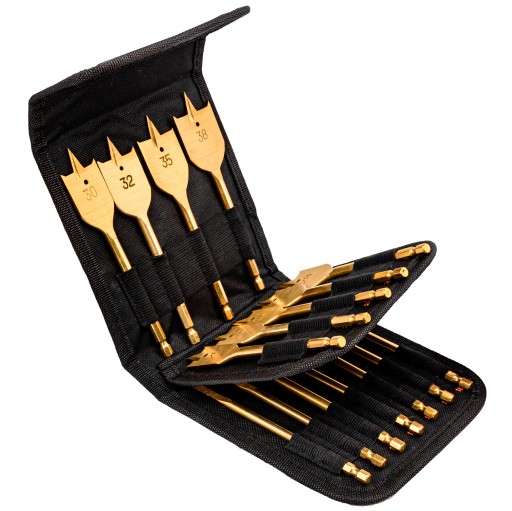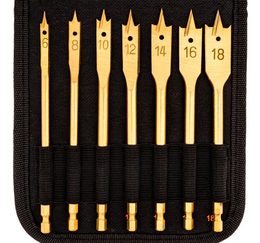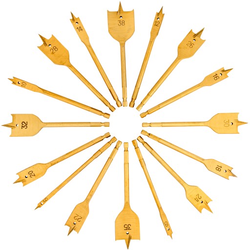 Zestaw profesjonalnych łopatkowych wierteł do drewna. Wiertła wykonane z wysokogatunkowej stali węglowej, hartowanej.