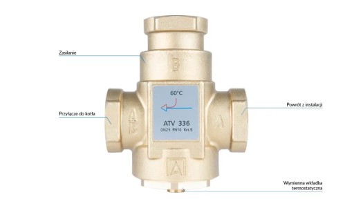 Zawory temperaturowe ATV wykonane są z mosiądzu i posiadają gwinty wewnętrzne. W zaworze umieszczony jest element termostatyczny, który reguluje temperaturę wody wracającej do kotła i utrzymuje ją na stałym minimalnym poziomie. Temperatura znamionowa zaworu określa temperaturę otwarcia, przy której rozpoczyna się otwieranie przyłącza A przez element termostatyczny. Pozycja montażowa zaworów ATV jest dowolna. Zastosowanie zaworów ATV nie wymaga stosowania dodatkowych zaworów regulacyjnych na przyłączach.