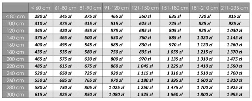 szerokość 195 cm - z tabeli wybieramy 181- 210 cm
