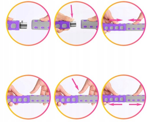 W paczce, w zależności od rozmiaru hula hoop otrzymasz 6 fragmentów całej konstrukcji. By połączyć je ze sobą trzeba przytrzymać wciśnięty przycisk i deikatnie wsunąć fragment do otworu kolejnego elementu. Prawda, że proste?