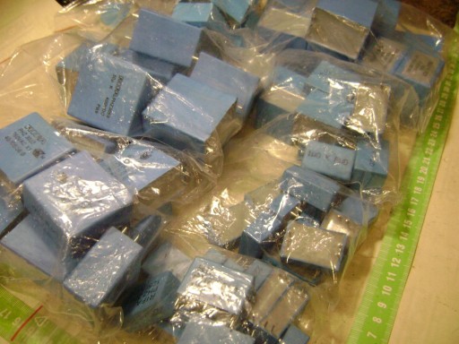 Charakterystyczny kondensator znanej marki RIFA w kształcie kostki.