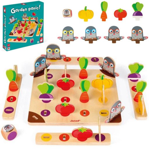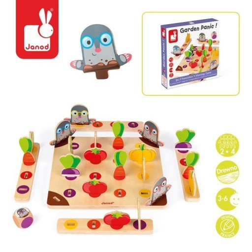 Gra wyścig Strzeż się kreta! francuskiej marki JANOD to wspaniała zabawa dla dwóch do czterech osób – zarówno dzieci, jak i dorosłych. Zestaw zawiera drewnianą planszę, podkładki i elementy, które się na nich umieszcza, tj. 4 krety oraz po 4 sztuki warzyw: rzepy, pomidorów, marchewki i dyni, tworzących mały ogródek. Gracze wcielają się w role ogrodników i mają za zadanie zebrać koszyk pełen plonów, wykazując się sprytem i unikając kretów. Wygrywa gracz, który jako pierwszy zgromadzi po jednym z każdego gatunku warzyw.