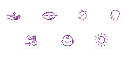 Produkt wskazany do regeneracji popękanych kącików ust, otarć naskórka oraz stosowania na skórę często narażoną na szkodliwe działanie czynników zewnętrznych. Już po pierwszej aplikacji następuje wyraźna i odczuwalna poprawa zarówno natłuszczenia jak i nawilżenia skóry. Stosowana regularnie skutecznie zabezpiecza nawet bardzo suchą skórę przed nadmiernym wysychaniem, rogowaceniem, pękaniem czy złuszczaniem. Dzięki przywróceniu fizjologicznego płaszcza hydrolipidowego, wysuszona, skłonna do podrażnień skóra staje się ukojona, szybciej się regeneruje i jest bardziej odporna na szkodliwe działanie czynników zewnętrznych. Poprzez poprawę nawilżenia, natłuszczenia oraz regenerację sucha czy szorstka skóra staje się wygładzona, miękka i przyjemna w dotyku, nabiera zdrowego promiennego wyglądu.