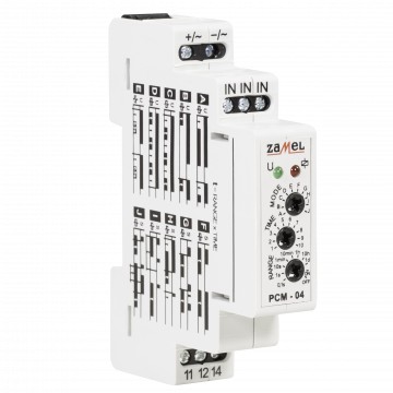 Wielofunkcyjny przekaźnik czasowy PCM-04/24V służy do realizacji funkcji czasowych w układach automatyki i sterowania. Posiada 10 niezależnych trybów pracy wyzwalanych napięciem zasilającym lub zewnętrznym impulsem wyzwalającym (pochodzącym z linii L lub N). Cechuje go bardzo szeroki zakres nastaw czasu oraz funkcje stałego załączenia i wyłączenia. Możliwa jest zmiana trybu bez konieczności oczekiwania na zakończenie aktualnie wykonywanego cyklu.