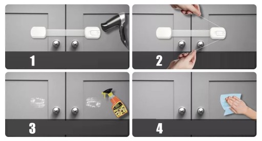 3. Usuwanie resztek kleju: Po odłączeniu zabezpieczenia można usunąć ewentualne pozostałości kleju lub taśmy samoprzylepnej z powierzchni szuflady lub szafki. Można to zrobić delikatnie, używając palca lub delikatnego środka czyszczącego.