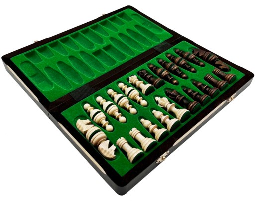 Szachownica wykonana z drewna lipowego, bejcowana oraz lakierowana, okuta zapięciem w odcieniu złota. Środek wyłożony zieloną wkładką.