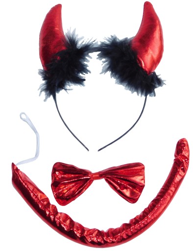 Zestaw zawiera pelerynę, opaskę z rogami, ogon, elegancką muchę jak również pelerynę w kolorze czarnym z czerwonym kołnierzykiem.