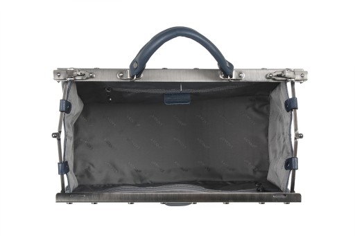 Wnętrze wykończone firmową, żakardową podszewką z bocznymi kieszeniami na drobiazgi, zamykanymi suwakami. Stalowa listwa zamykająca kufer to retro patent na szeroki, wygodny dostęp do przestronnego wnętrza. Jest to niezbędna cecha przy medycznym zastosowaniu kufra. Skórzana rączka mocowana stalowymi okuciami zapewnia wytrzymałość przy większych obciążeniach. Metalowe stopki zabezpieczają dno kufra przed uszkodzeniami i zabrudzeniem. Na zewnątrz, z tyłu torby dodatkowa kieszeń na podręczne rzeczy.