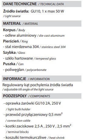 - materiał oprawy- pierścień ze stali nierdzewnej, elementy aluminium.