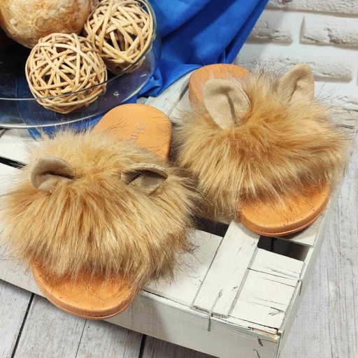 Urocze klapki damskie z miękkim puszkiem i uszkami. Elastyczna gumowa podeszwa - specjalnie wyprofilowana aby zwiększyć komfort w trakcie chodzenia. Dzięki szerokiemu paskowi z futerkiem dobrze trzymają się nogi. Miękkie syntetyczne futerko i zabawne uszka dodają im kokieterii. Idealne uzupełnienie domowych stylizacji.
