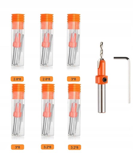 - 6 wierteł o wymiarach: 2.8 x 8mm, 2.8 x 10mm, 3 x 8mm, 3 x 10mm, 3.2 x 8mm, 3.2 x 10mm.