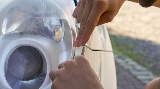 1️⃣ Przygotowanie – umyj reflektor, osusz i dokładnie oklej sąsiednie elementy taśmą maskującą, aby nie zabrudzić lakieru auta.