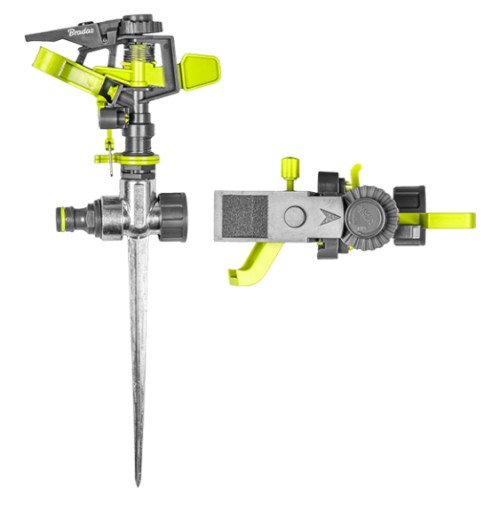 Zraszacz pulsacyjny wbijany na metalowym przelotowym kolcu z wysokiej jakości tworzywa. Regulowana wielkość i kształt obszaru zraszania. Blokada dla spryskiwania wybranego sektora. Kolec posiada nypel do szybkozłączy i możliwość szeregowego połączenia z innymi zraszaczami.