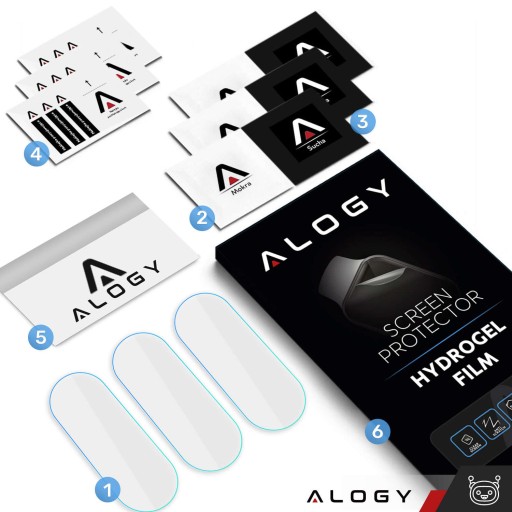 - W zestawie: 3x Folia hydrożelowa Alogy, 3x mokra ściereczka, 3x sucha ściereczka, 3x Zestaw naklejek pozycjonujących i naklejka odpylająca, 1x Rakla