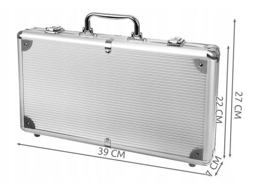 Specyfikacja - materiał walizki: aluminium; wymiary walizki (dł/szer/wys): 39/7/27cm; waga zestawu opakowaniem: 4,5k