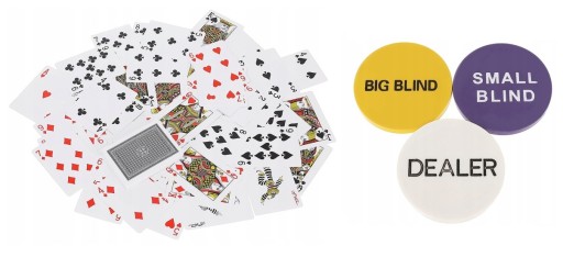 - ŻETONY FUNKCYJNE – do zestawu dołączono zestaw 3 żetonów funkcyjnych, które pozwalają zachować kolejność oraz porządek w grze. DEALER to żeton rozdającego, podczas gry przemieszcza się zgodnie ze wskazówkami zegara. SMALL BIND oznacza pierwszego gracza siedzącego ze Dealerem. BIG BLIND oznacza drugiego gracza siedzącego za Dealerem.