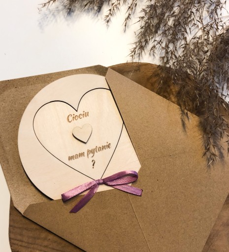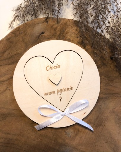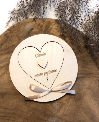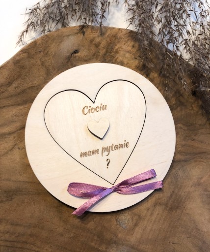 Pomysłowa drewniana kartka z prośbą do cioci i wujka o zostanie rodzicami chrzestnymi Twojego dziecka. Jest to to idealny prezent dla przyszłych rodziców i pamiątka.