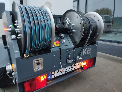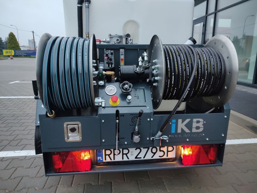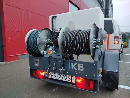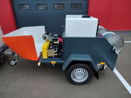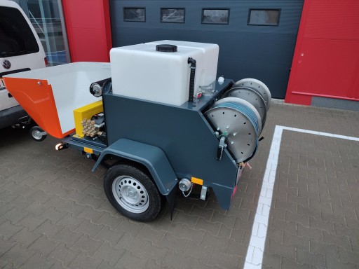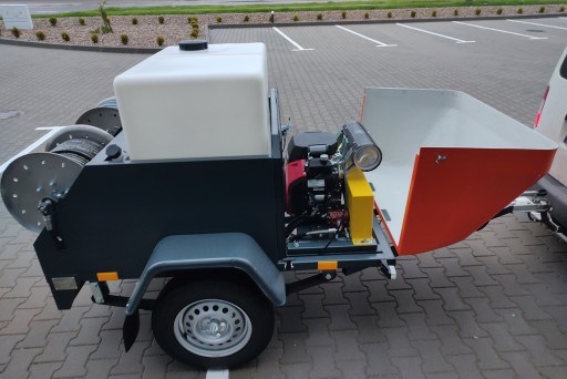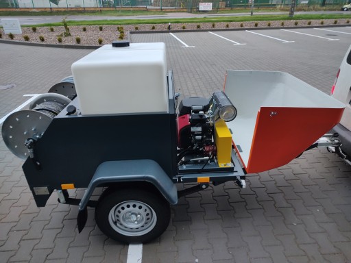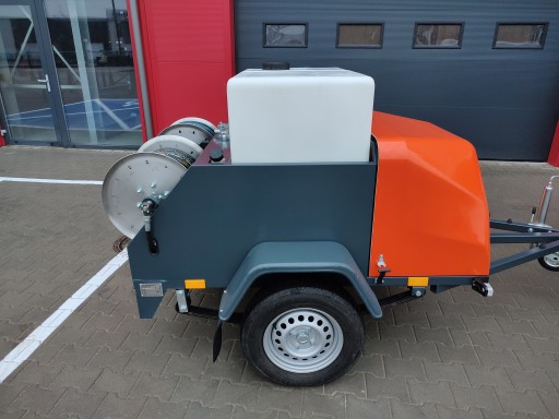 OPIS: urządzenie bardzo funkcjonalne, o małych gabarytach, służące do czyszczenia kanalizacji; skrzynka narzędziowe pod bębnem napełniającym, przyczepa lekka.