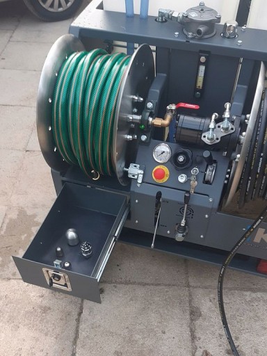 wąż zamontowany na bębnie o napędzie hydraulicznym, długość 60m, średnica wewnętrzna węża NW 13mm.