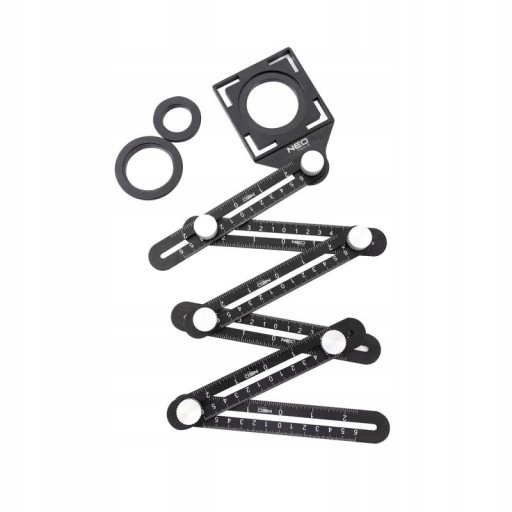 Linijka kątowa, 6 ramiona, ramion wykonane z aluminium, szablon otworów wykonany z tworzywa sztucznego (ABS), sześć ramion o długości skali od 0 do 6 cm w obu kierunkach (0-2 cale), wymiary otworów: 2,5 cm, 4 cm, 4,5 cm, podziałka w cm i inch, odporny na upadki, trwały, zastosowanie: odwzorowywanie i przenoszenie kształtów przy pracy z: cegłami, drewnem, glazurą, terakotą, metalem itd.
