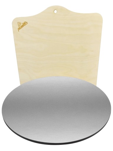Zestaw składa się z okrągłej stali do pizzy o wymiarach Ø350 x 8 mm i wadze 6 kg oraz drewnianej łopaty ze sklejki brzozowej o wymiarach 380 x 350 x 3 mm.