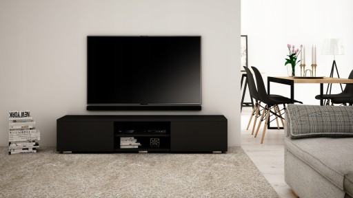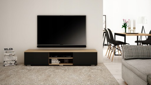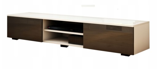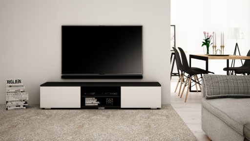 OPIS: W/S/G 45/140/35 cm- korpus oraz fronty w macie, po środku regulowana półka na sprzęt RTV, dwie przestronne komory otwierane dotykowo TIP-ON (bez uchwytu), płyta tylna szafki wykonana z HDF.