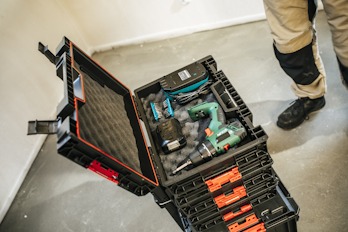 Qbrick System PRO Toolcase w standardzie posiada gąbkę ochronną (na górnej klapie i dolnej) przez co zapewnia stabilizację narzędzi wewnątrz skrzynki i zapobiega niekontrolowanemu przemieszczaniu się ich. Skrzynka idealnie nadaje się jako skrzynka na elektronarzędzia ponieważ jest wodoszczelna i pyłoszczelna dzięki uszczelce.