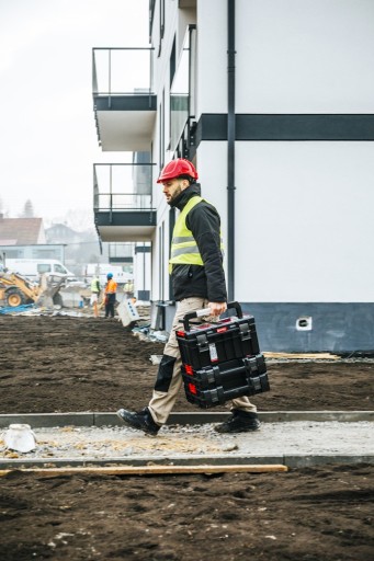 Toolcase ma pojemność 11L dzięki temu bez problemu mieszą się różne narzędzia jak: szlifierka kątowa, wkrętarka, wiertarka itp