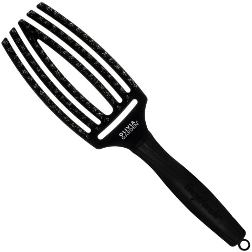 Szczotka Olivia Garden Finger Brush, idealna do rozczesywania włosów. Posiada specjalnie profilowany kształt głowicy, dzięki temu lepiej masuje skórę głowy. Oprócz tego wyróżnia ją specjalne połączenie antystatycznych kolców zakończonych kulką w 100% z włosia dzika. Włosy zyskują objętości oraz blasku. Idealnie sprawdzi się zarówno w salonie fryzjerskim oraz w domowym zaciszu.