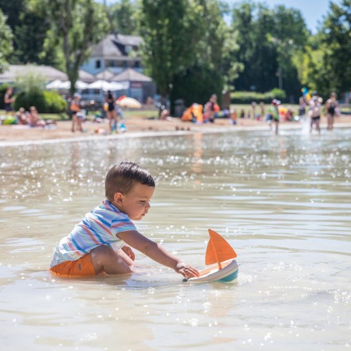 - - niebiesko-biała żaglówka przeznaczona do zabawy w wodzie