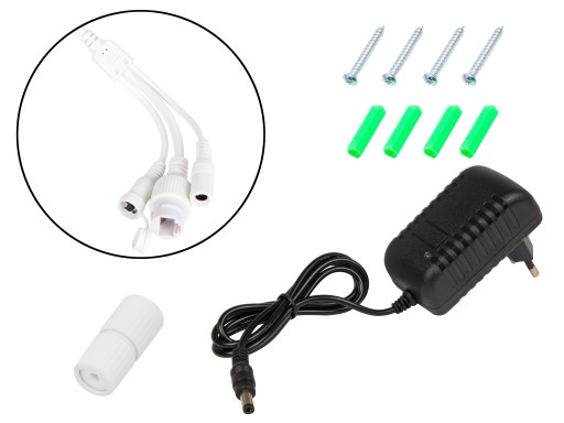 Dedykowany zasilacz DC 12V/2A z wtykiem DS 2,1/5,5mm w zestawie z urządzeniem. W opakowaniu znajdziemy także kołki montażowe, zabezpieczenie połączenia kabla, instrukcję obsługi.