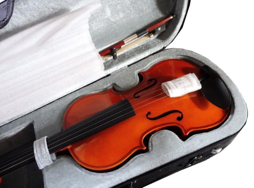 Skrzypce przygotowane do gry przez lutnika: ustawiona dusza, podstawek, wykonane pierwsze strojenie, naniesiona kalafonia na smyczek, nasmarowane kołki