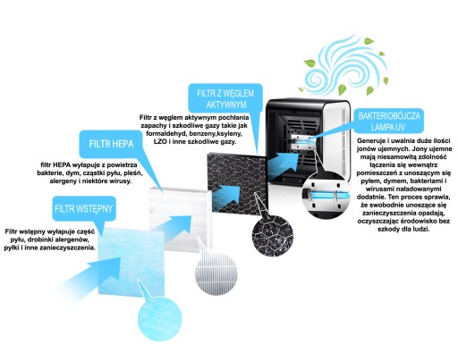 ✔️ Sposób oczyszczania powietrza: filtr 3-stopniowy + generator jonów ujemnych + lampa bakteriobójcza UV