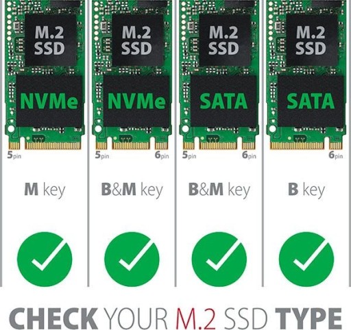 Uwag.: UWAGA! W adapterze można wprowadzić B+M-key diski do obu slotów M.2. Ważne jest przeprowadzić kontrolę parametrów dysku - tzn. czy dysk jest przeznaczony do interfejsu SATA lub NVMe (PCI-Express) i przyłączyć go do poprawnego slotu. Diski SATA są podłączone do gniazda B-key, diski NVMe są podłączone do gniazda M-key
