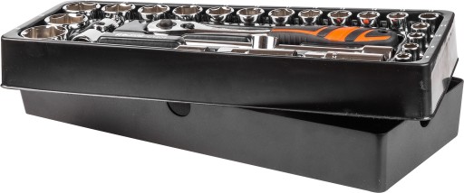 W zestawie znajdują się również akcesoria takie jak: pokrętło 1/2", przedłużka 1/2" 125 mm przedłużka 1/2" 250 mm, przegub Cardana 1/2", redukcja 1/2" - 1/4" oraz 18 sztuk nasadek w zakresie rozmiarów 8 – 32 mm.Wszystkie akcesoria i nasadki, zostały wykonane ze stali Cr-V, polerowane.Każdy element zestawu ma przypisane i uporządkowane miejsce. Dodatkowo załączana jest sztywna wkładka, która ułatwia utrzymanie wkładu w czystości , porządku jednocześnie zabezpieczając zestaw.
