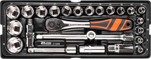 Zestaw 25-elementowy, grzechotka 1/2” + akcesoria i nasadki umieszczony we wkładzie do wózka warsztatowego typu A.