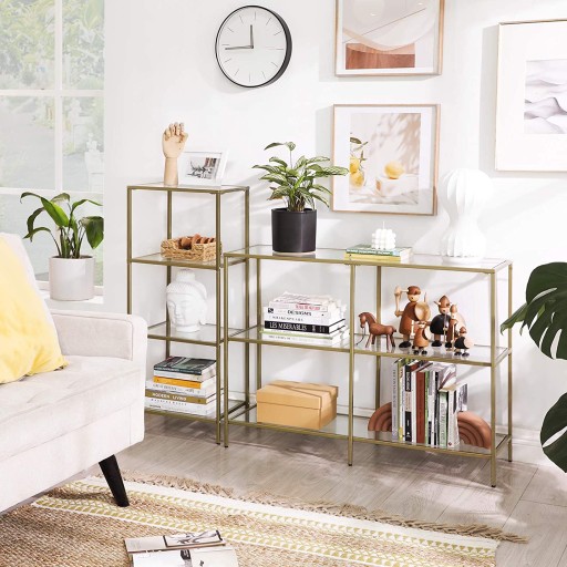 Pięciopoziomowy regał ze złotą ramą w stylu Art Deco, glamour.