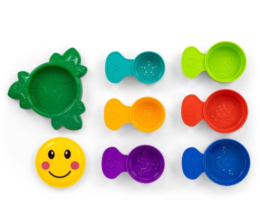 Zabawka do kąpieli Składany Kwiatek od Milly Mally. 6 kolorowych kubków do składania, ustawiania w wieżę, jako foremki do piasku. Każdy z nich posiada dziurki w dnie dzięki czemu można przez nie również przelewać wodę, przesiewać piasek do zabawy domu, na placu zabaw, na plaży. Kolory i wytłoczone kształty na kubkach pomagają w nauce.