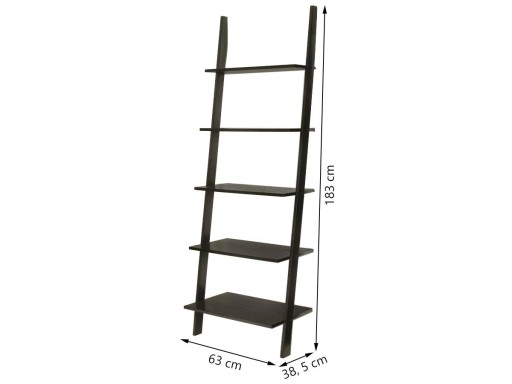 Wykonany z drewna kauczukowego lakierowanego na kolor czarny. Pięć półek jest fornirowanych czarnym dębem. Półka drabinowa, która wprowadzi do każdego pomieszczenia melancholijny nastrój. Posiada 5 pojemnych półek, które wyróżnią znajdujące się na nich przedmioty. Co za idealne miejsce na rośliny doniczkowe i przedmioty osobiste. Występuje w eleganckim czarnym kolorze, który dobrze komponuje się z innymi kolorami i materiałami.