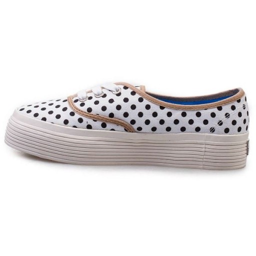 Białe z beżową lamówką i czarnymi grochami.
