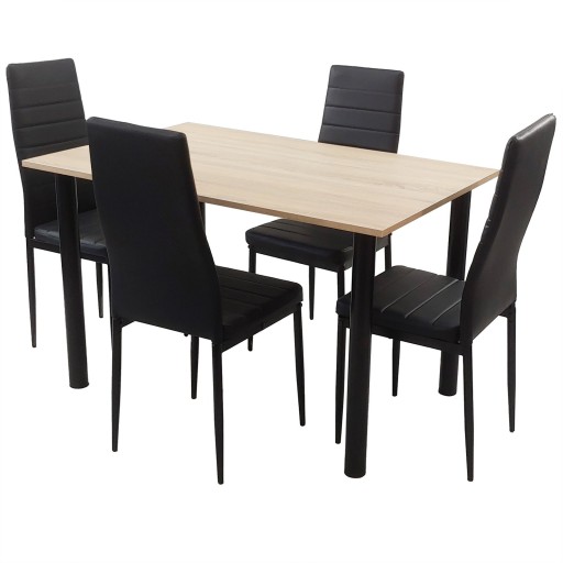 Wygodny zestaw kuchenny. Świetny również do kawiarni, baru, restauracji. Konstrukcja krzeseł wykonana z metalu, a tapicerka z trwałej, odpornej na zabrudzenia ekoskóry. Stolik to blat wykonany z laminowanej płyty meblowej oraz cztery metalowe, okrągłe nogi.