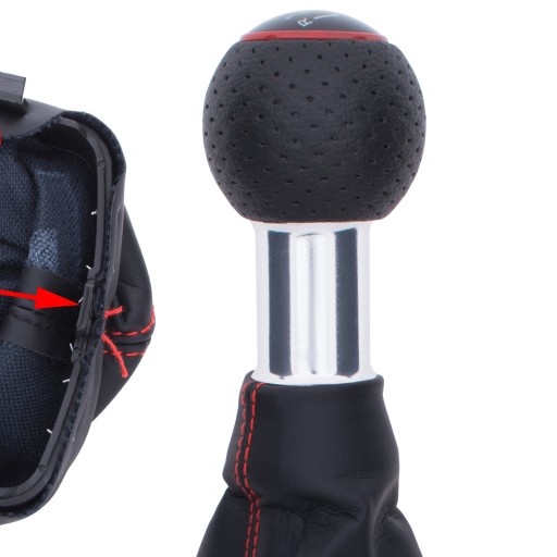 Schemat: 5 biegów + R, czarna nakładka z czerwonym pierścieniem i białym schematem