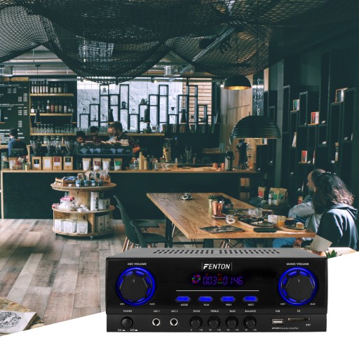 Wzmacniacz karaoke Fenton AV440 to cyfrowy wzmacniacz z dwoma wejściami mikrofonowymi, dzięki czemu możesz śpiewać razem. Dzięki funkcji Bluetooth w AV440 możesz łatwo stworzyć zestaw karaoke Bluetooth. Wbudowany odtwarzacz MP3 może odtwarzać muzykę MP3 bezpośrednio z pamięci USB, a do wejścia z tyłu można podłączyć dowolne zewnętrzne urządzenie audio. Aby uzyskać profesjonalny dźwięk, do sygnału z mikrofonu (-ów) można dodać efekt echa. Dzięki Fenton AV440 masz idealną podstawę do złożenia zestawu karaoke.