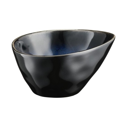 Miseczka z kolekcji wysokiej jakości naczyń kamionkowych Dark Night. Linię charakteryzują nieregularne kształty talerzy i miseczek, a także zdobienia reaktywnym szkliwem, tworzącym niepowtarzalne wzory. Naczynia barwione są na czarno i pokryte jednostronnie szkliwem w odcieniach niebieskiego. Ich wykończenie jest gładkie i błyszczące, co podkreśla głębię kolorów. Zestawione ze sobą naczynia z kolekcji Dark Night stworzą niezwykłą kompozycję na stole, która będzie piękną oprawą wyjątkowych dań.