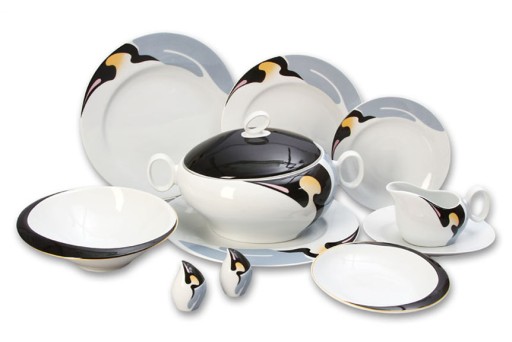 Na powierzchni porcelany znajdziemy zdobienie w postaci efektownie wkomponowanych w kształt naczyń pingwinów.