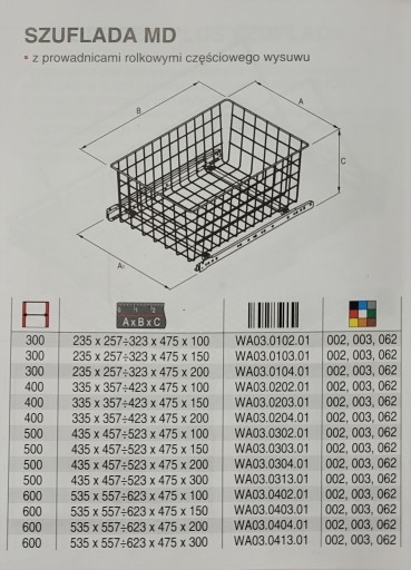 Dostępne SZUFLADY KOSZE MD do szafek o szerokości 30,40,50,60 cm, w 3 wariantach wysokości :H-100, H-150, H-200, (H-300 tylko dla koszy 50 i 60).