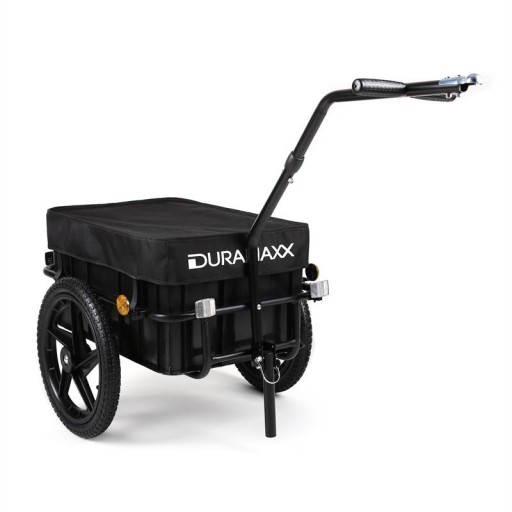 Przyczepka rowerowa Big-Black-Mike jest też bardzo użyteczna podczas zakupów. Na jej wytrzymałym metalowym stelażu można umieścić do dwóch skrzynek z napojami i przetransportować bez wysiłku do domu. Przyczepkę można też odłączyć od roweru i używać jako wózek ręczny - wysoki dyszel ze sprzęgiem kulowym zapewnia błyskawiczny montaż. Uchwyty znajdują się na poręcznej wysokości do ciągnięcia wózka, a montowana nóżka zapewnia bezpieczne odstawienie przyczepki Duramaxx na bruku, żwirze lub łące.
