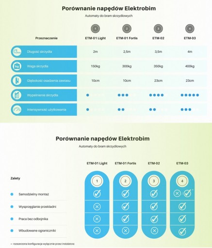 ETM-01 Fortis to zestaw automatyki do samodzielnego montażu przeznaczony do bram uchylnych, których skrzydła ważą maksymalnie 300kg i mają szerokość nie większą niż 2,5m. Siłowniki do bramy Fortis mogą być zamontowane na słupkach o przekroju od 8 do 16cm. Napęd ten bez wątpienia sprawdzi się na bramach przewiewnych oraz pełnych. Kolejną zaletą jest brak konieczności montażu odbojnika na środku bramy. Ze względu na swój schludny oraz smukły charakter siłowniki idealnie będą pasowały do większości bram wjazdowych na posesje.