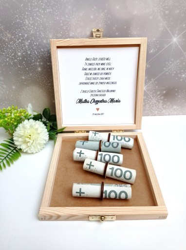 Drewniane pudełeczko z personalizowanymi życzeniami i miejscem na gotówkę lub inny prezent.