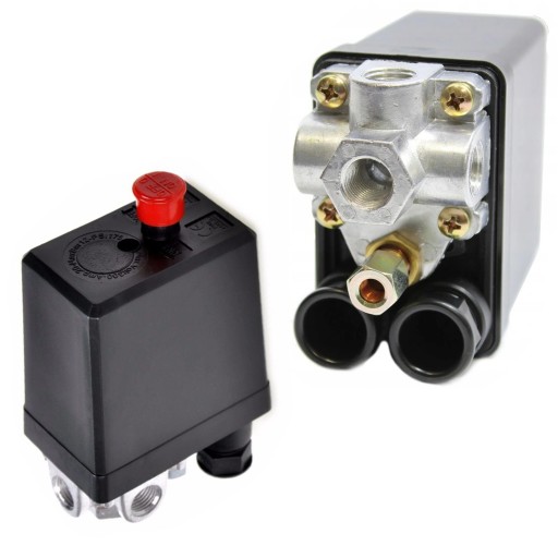 Wyłącznik ciśnieniowy do kompresora. Wyłącznik automatycznie wyłącza kompresor gdy ciśnienie osiągnie maksymalną wartość i włącza go gdy wartość ciśnienia spadnie.
